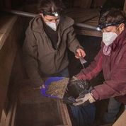 Wir haben zwei Kästen gereinigt und auch noch bei einem abgebauten Kasten im Westen die alten Nestbaureste mitgenommen. Dabei fanden wir auch zwei sehr alte, nicht ausgeschlüpfte Dohleneier. Das alte Nistmaterial, meist gröbere Zweige, füllten wir im Schein unserer Stirnlampen in Müllsäcke.