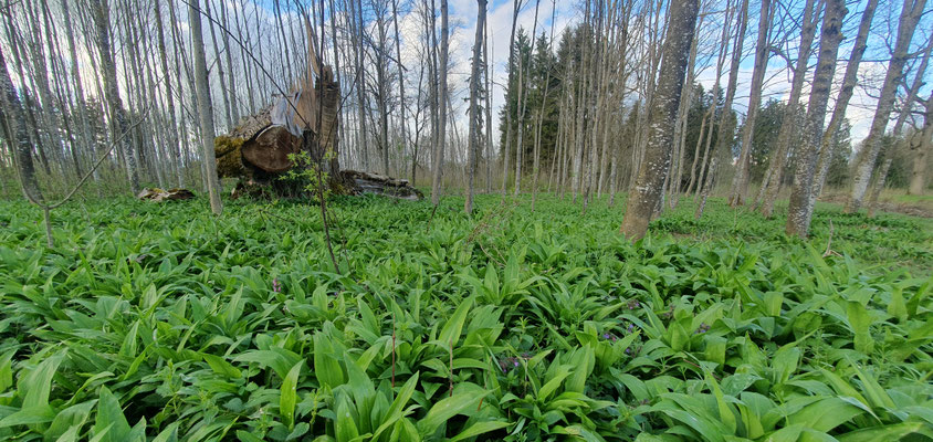 In der Lagune kamen die Teilnehmer an einem großen Bärlauchfeld vorbei. Der Unterschied zwischen Bärlauch und dem Grün der Herbstzeitlosen konnte gut am Au-Damm demonstriert werden. Zum Abschluß kam die Gruppe noch an einer mächtigen Biberburg vorbei.
